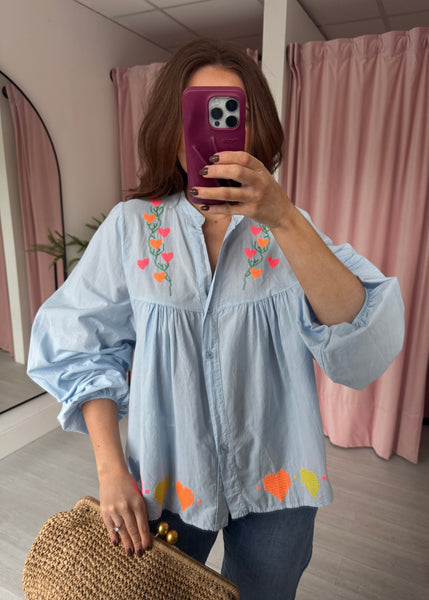 This cotton button-through shirt features a clean grandad collar and delicate neon heart embroidery. Finished with balloon sleeves and elasticated cuffs for an easy yet statement look.