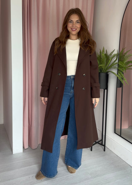 This coat is timeless, stylish, comfortable and so versatile. Perfect to throw over any daytime outfit, evening outfit and it looks equally good worn dressed down with trainers and a hoodie. The fabric is the same on both sides which lends itself so well to being unlined, so it's lovely and lightweight yet still really warm. It's has a revere collar and is double breasted so it is very flattering. Side pockets and tie belt to cinch it in.