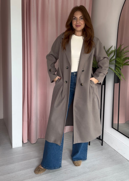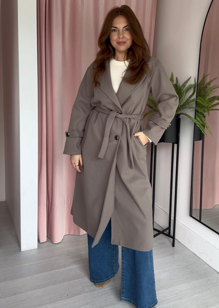 This coat is timeless, stylish, comfortable and so versatile. Perfect to throw over any daytime outfit, evening outfit and it looks equally good worn dressed down with trainers and a hoodie.  The fabric is the same on both sides which lends itself so well to being unlined, so it's lovely and lightweight yet still really warm.  It's has a revere collar and is double breasted so it is very flattering. Side pockets and tie belt to cinch it in.